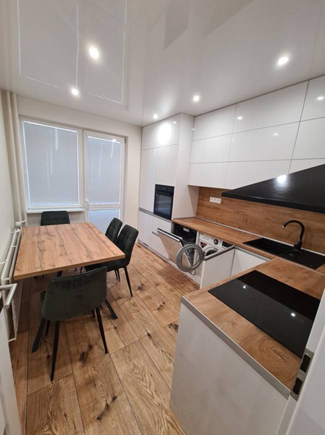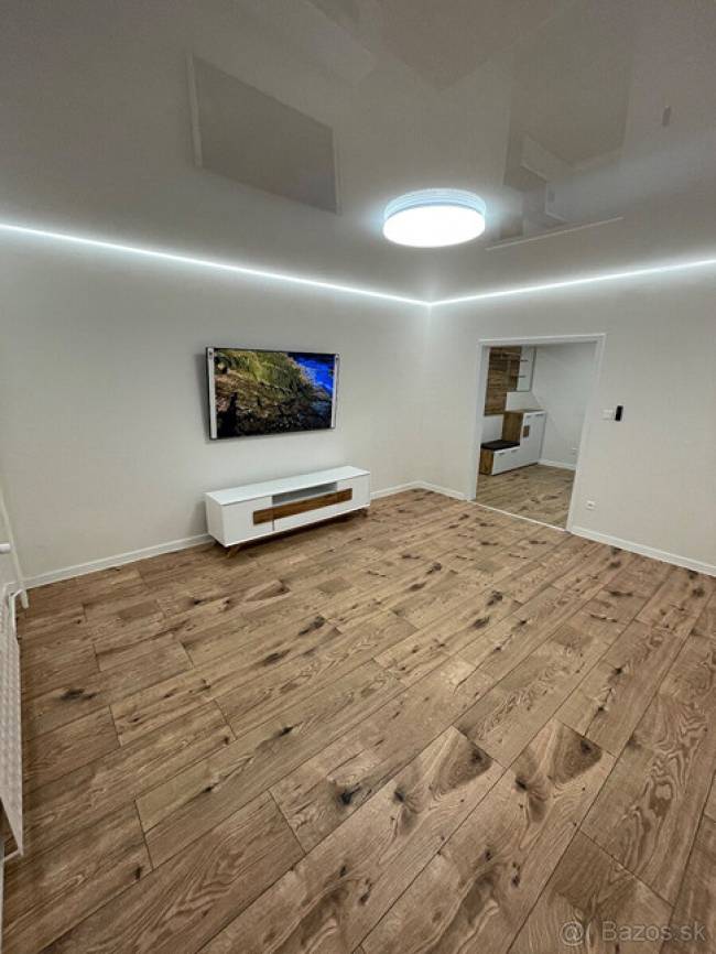 Vyrovnanie podláh v celom byte nivelizáciou. Nové vinylové podlahy, znížené stropy technológia napínacie stropy so zabudovaným led osvetlením, stierky nové biele, nové interiérové dvere v bielom prevedení s obložením zárubne, plastové okná so žalúziami, nová kuchynská linka do tvaru L ( biely lesk) s led podsvietením kuchynskej linky so zabudovanými spotrebičmi ako je chladnička s mrazničkou, indukčná varná doska, elektrická rúra, digestor, čierny granitový drez s batériou, umývačka riadu, pračka zabudovaná v kuchynskej linke, vchodové bytové dvere sú bezpečnostné.