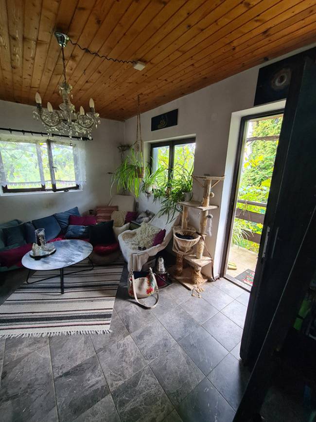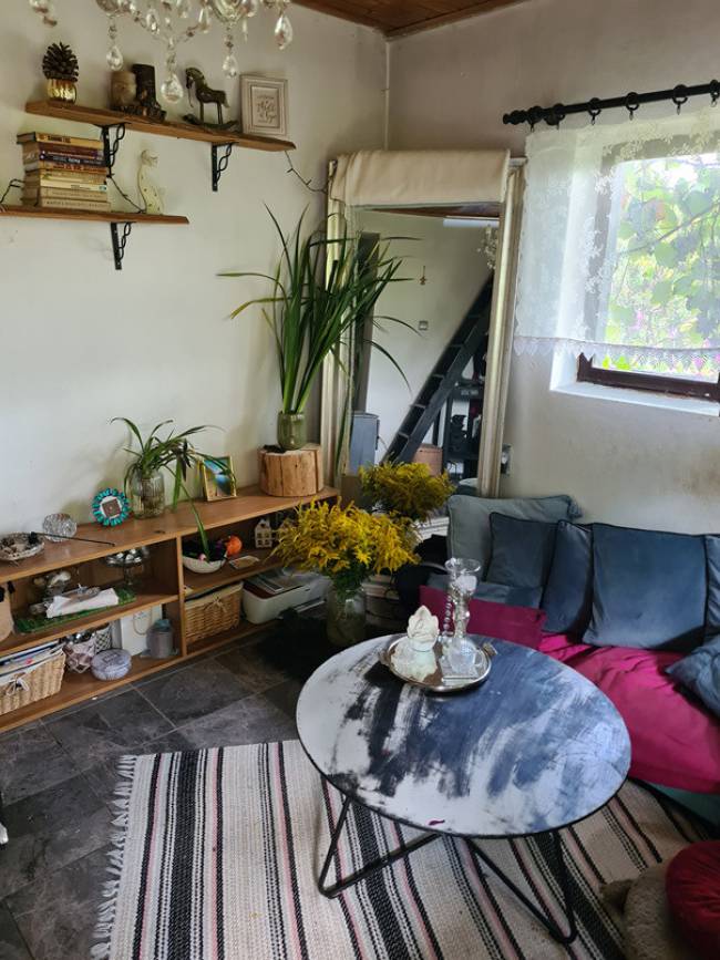 V spodnej časti je pivnica, ktorá momentálne slúži ako sklad. Sú tam 3 miestnosti. Tento priestor je možné využívať aj ako letnú kuchyňu. Po pár schodíkoch sa dostanete cez gang, ktorý je do tvaru L po obvode do hlavnej obytnej časti (spodná časť) kde je denná miestnosť s kuchynskou časťou a kúpeľňa s WC. Po schodisku sa dostanete do podkrovia, kde je jedna veľká miestnosť (využívaná ako spálňa) s výstupom na priestrannejší balkón.