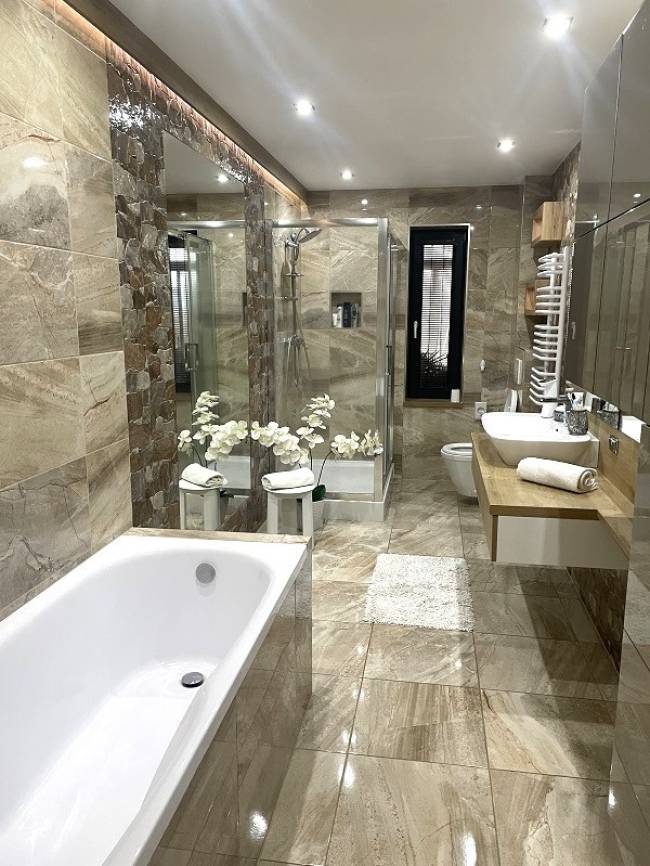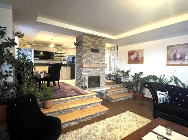 - VEĽKÝ APARTMÁN na prízemí pre 9 osôb : samostatný vchod, vstupná chodba, odkladacia miestnosť, 2 spálne, kúpeľňa so sprchou, vaňou a WC, samostatné WC, kuchyňa s obývačkou a krbom, práčovňa, kotolňa, komora a veľká 50 m2 prestrešená terasa