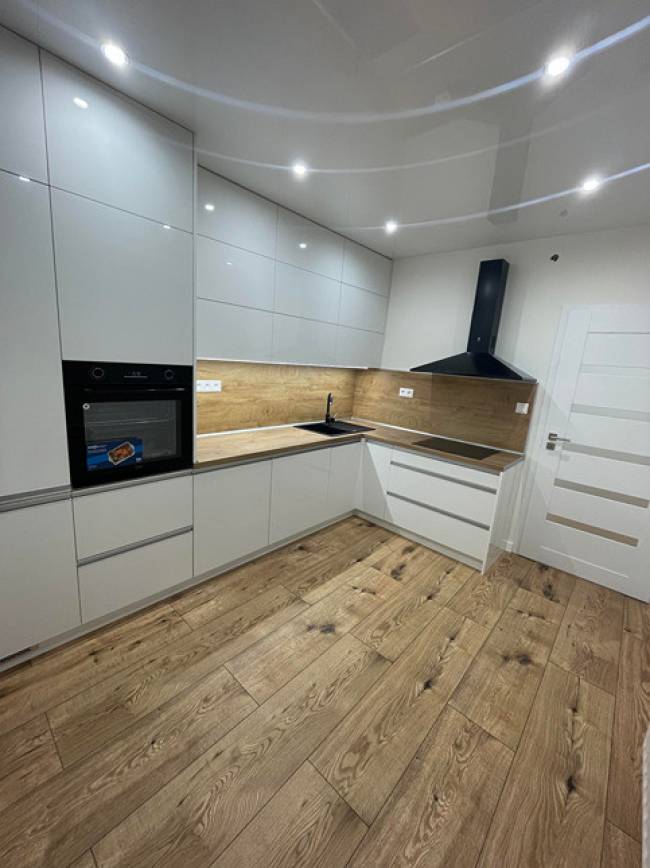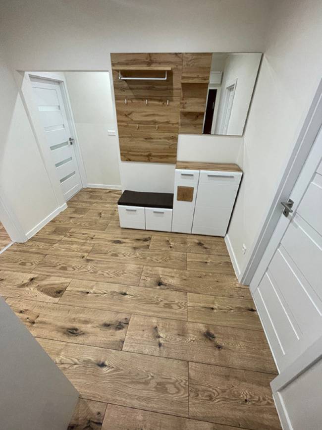 Vyrovnanie podláh v celom byte nivelizáciou. Nové vinylové podlahy, znížené stropy technológia napínacie stropy so zabudovaným led osvetlením, stierky nové biele, nové interiérové dvere v bielom prevedení s obložením zárubne, plastové okná so žalúziami, nová kuchynská linka do tvaru L ( biely lesk) s led podsvietením kuchynskej linky so zabudovanými spotrebičmi ako je chladnička s mrazničkou, indukčná varná doska, elektrická rúra, digestor, čierny granitový drez s batériou, umývačka riadu, pračka zabudovaná v kuchynskej linke, vchodové bytové dvere sú bezpečnostné.
