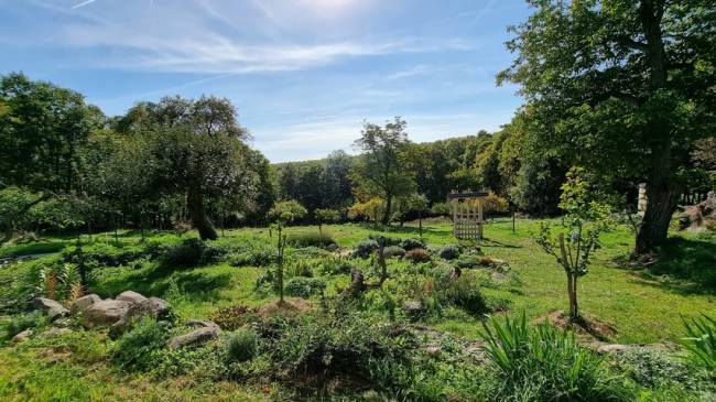 • Záhrada: úžitková záhrada s ovocnými stromami, skleníkom a nádržami na dažďovú vodu v zemi.